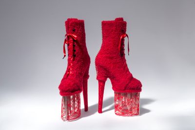 De Gruiter transformeert de historische chopines van de 16de eeuw, ooit gedragen door aristocratische dames en courtisanes als statussymbool, tot hedendaagse statements: glamoureuze fetisjobjecten, architectonische creaties en zelfs dodelijke wapens. In elk geval zijn ze meer dan mode; ze zijn artistieke expressie en maatschappelijk commentaar.